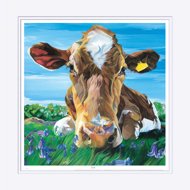 A Guernsey Cow basking in the sun. The original painting of beloved pet cow, Bluebell was actually commissioned as a birthday present from a husband to his wife.