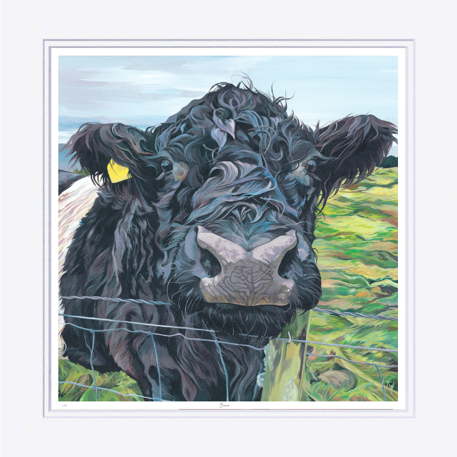 Bonnie is a very special lady. The original painting was actually commissioned by a gentleman as a gift for his wife. He visited me at my studio in York and was trying to decided between two Belted Galloway art prints. He told me how his wife had a met a Belty on a hike and showed me the photo she’d snapped of their fortunate encounter. He was just trying to decide which of my existing banded Galloways looked most like her photo. I said ‘hey, why don’t I just paint that one!’ and here she is! This piece was a pleasure to paint.