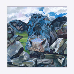 A curious cow finds a hole in the wall! “Me Again!” is a heartfelt and playful art print featuring a cheeky black cow peeking over a dry stone wall. Cows are nothing if not curious, and I just love the character of this particular cow as she greets us with a friendly “Me again!”